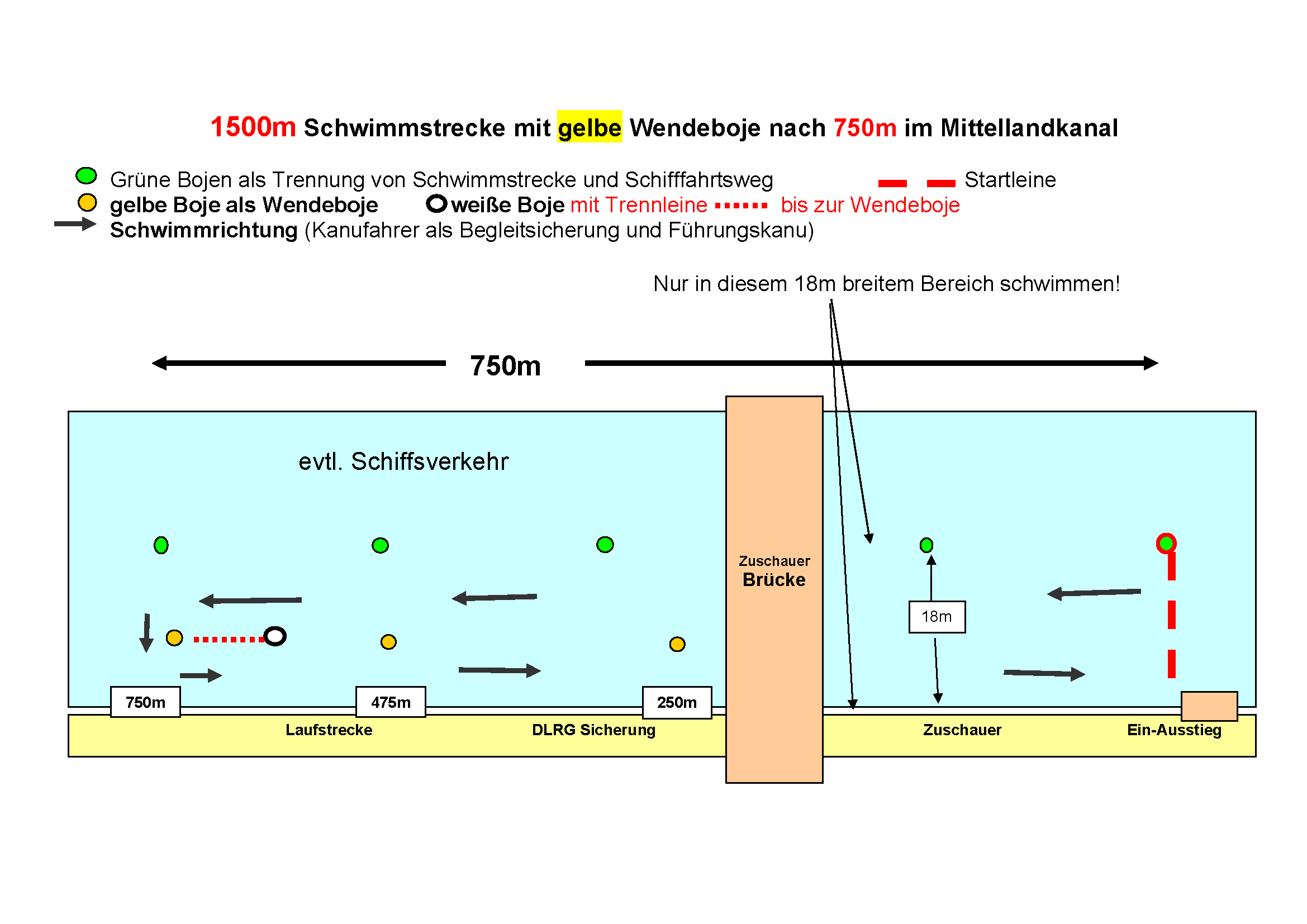 Die Schwimmstrecke (1,9km, 1,5km bzw. 0,5km) im Mittellandkanal grenzt direkt an die Wechselzone an. Die Strecke hat einen abgetrennten Schwimmbereich mit Wendepunkt und bietet viel Platz auf der Schwimmstrecke.